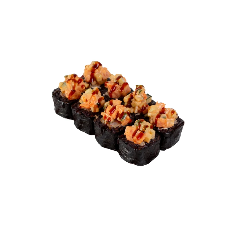 Рис черный, нори, креветка темпурная, сыр творожный, огурец, лосось копченый, спайси соус, унаги соус. Имбирь (10 г), васаби (3 г), соевый соус (30 г).