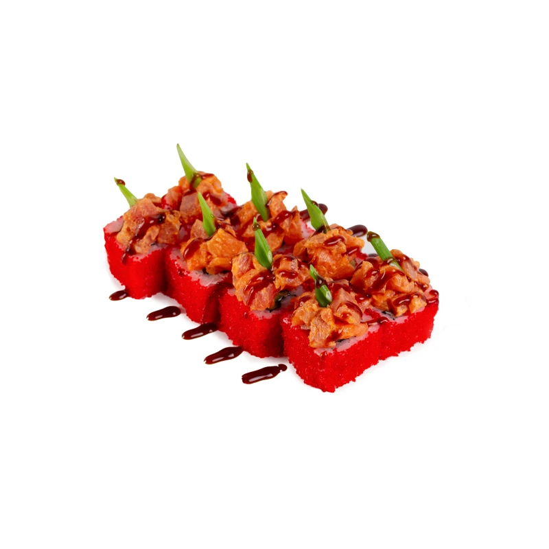 Рис, нори, сыр творожный, огурец, икра масага, тунец, лосось, спайси соус, унаги соус, лук зеленый. Имбирь (10 г), васаби (3 г), соевый соус (30 г).