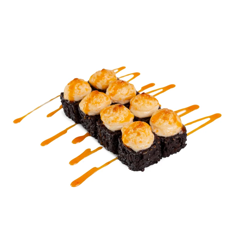 Рис черный, нори, сыр плавленный, курица копченая, яки соус, соус манго-чили. Имбирь (10 г), васаби (3 г), соевый соус (30 г). ВНИМАНИЕ! Ролл проходит тепловую обработку для запекания шапочки в течении 2-3 минут. Начинка при этом остается ХОЛОДНОЙ.