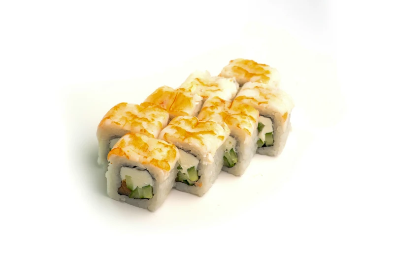 Рис, нори, творожный сыр, огурец, лосось копченый, креветки тигровые. Имбирь (10 г), васаби (3 г), соевый соус (30 г).