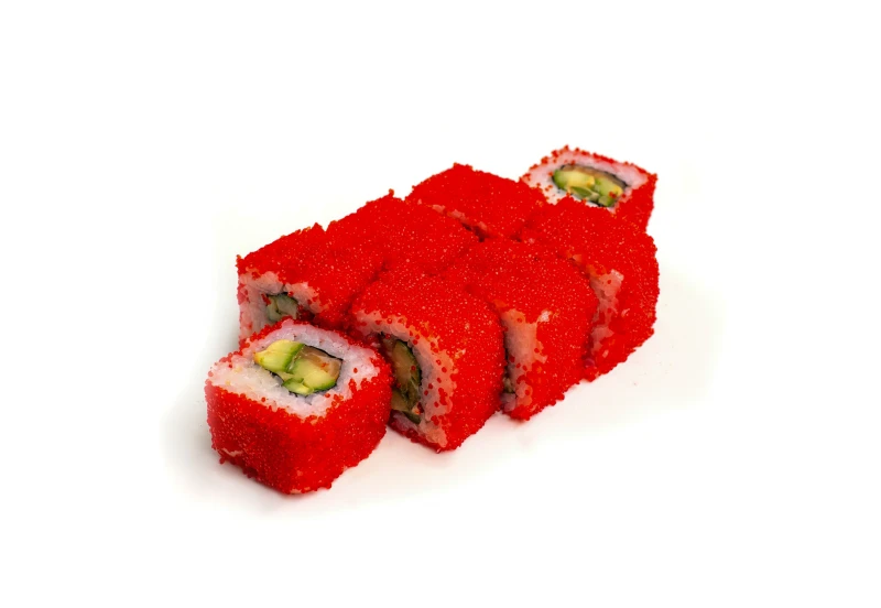 Рис, нори, огурец, лосось, икра масага , спайси соус. Имбирь (10 г), васаби (3 г), соевый соус (30 г).