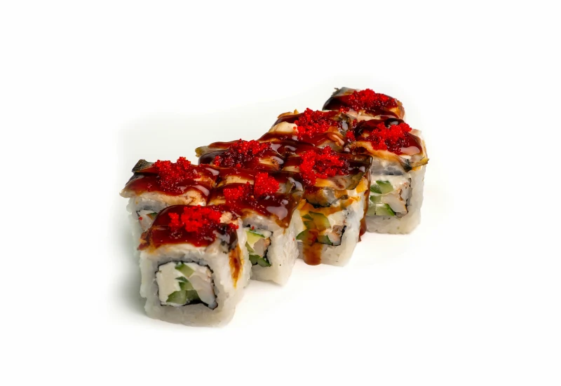 Рис, нори, креветки тигровые, сыр творожный, огурец, угорь жаренный, соус унаги, икра масага. Имбирь (10 г), васаби (3 г), соевый соус (30 г).