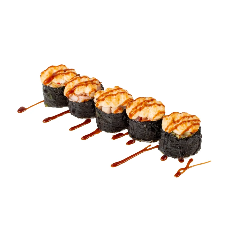 Гункан с лососем и помидором, Гункан с омлетом и крабом, Гункан с копченым лососем и огурцом, Гункан с тигровой креветкой, Гункан с копченой курицей, сырный соус, унаги соус. Имбирь (15 г), васаби (3 г), соевый соус (30 г).