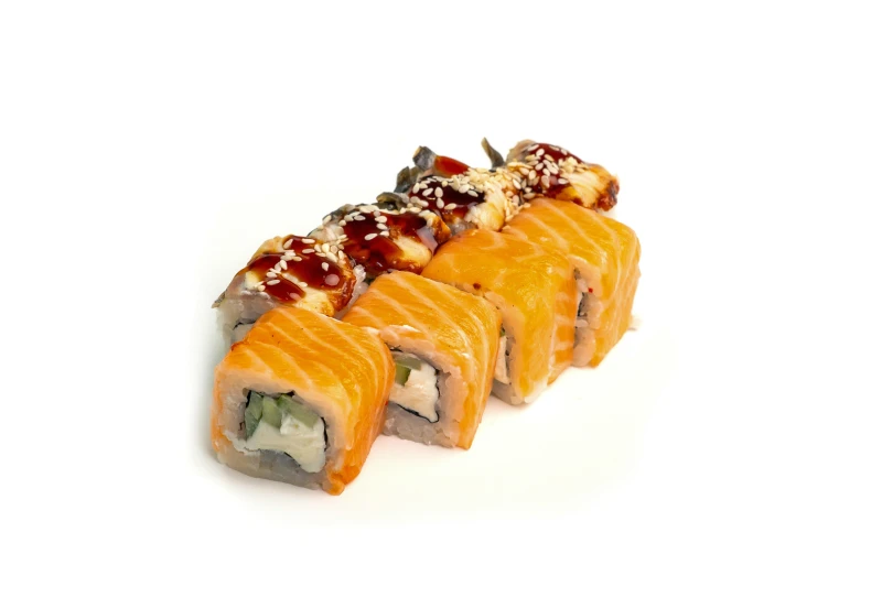 Рис, нори, сыр тврожный, огурец, лосось, угорь жаренный, унаги соус, кунжут. Имбирь (10 г), васаби (3 г), соевый соус (30 г.