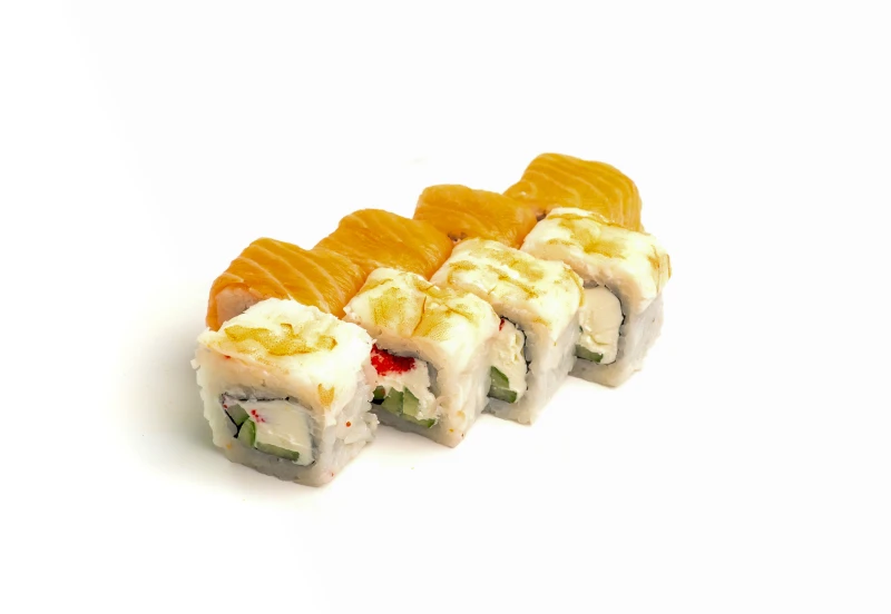 Рис, нори, огурец, сыр творожный, лосось, икра масага, креветки тигровые. Имбирь (10 г), васаби (3 г), соевый соус (30 г).
